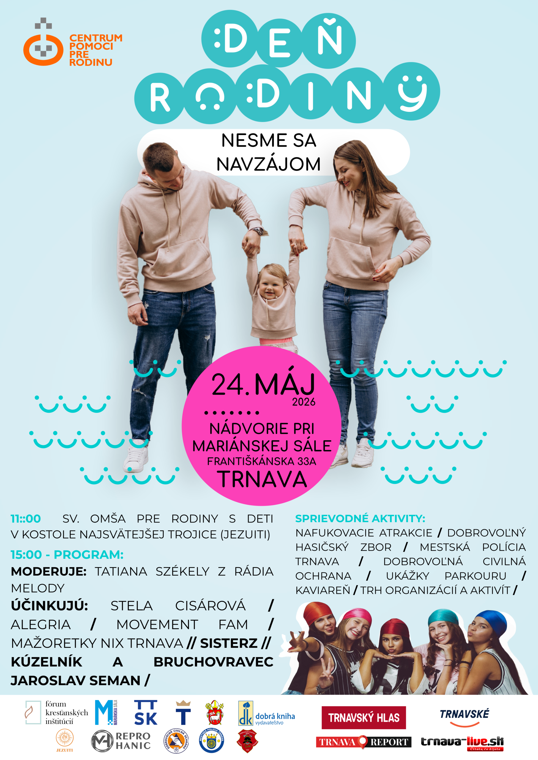 Centrum pomoci pre rodinu v Trnave sa aj tento rok hrdo hlási k Medzinárodnému dňu rodiny. Pri tejto príležitosti organizuje v nedeľu 24. mája 2026 už sedemnásty ročník celoslovenského podujatia Deň rodiny. Cieľom centra je vytvoriť v srdci Trnavy priestor, kde sa rodiny môžu zastaviť, užiť si spoločný čas a pocítiť podporu komunity.