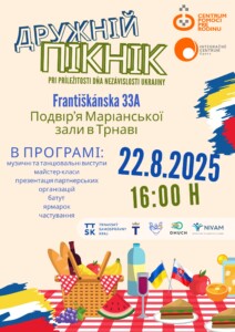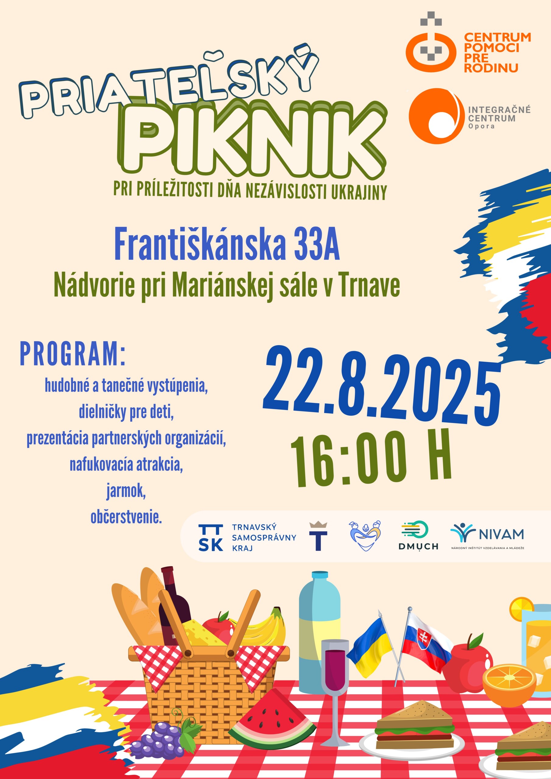 Pozývame vás na tretí ročník priateľského pikniku, pri príležitosti Dňa nezávislosti Ukrajiny. Aj týmto spôsobom oslávime významný deň pre našich susedov a zároveň priateľov. V rámci programu sa môžeme tešiť na hudobné a tanečné vystúpenia, dielničky pre deti, nafukovaciu atrakciu a najmä jarmok z výrobkami z nášho Integračného centra OPORA.